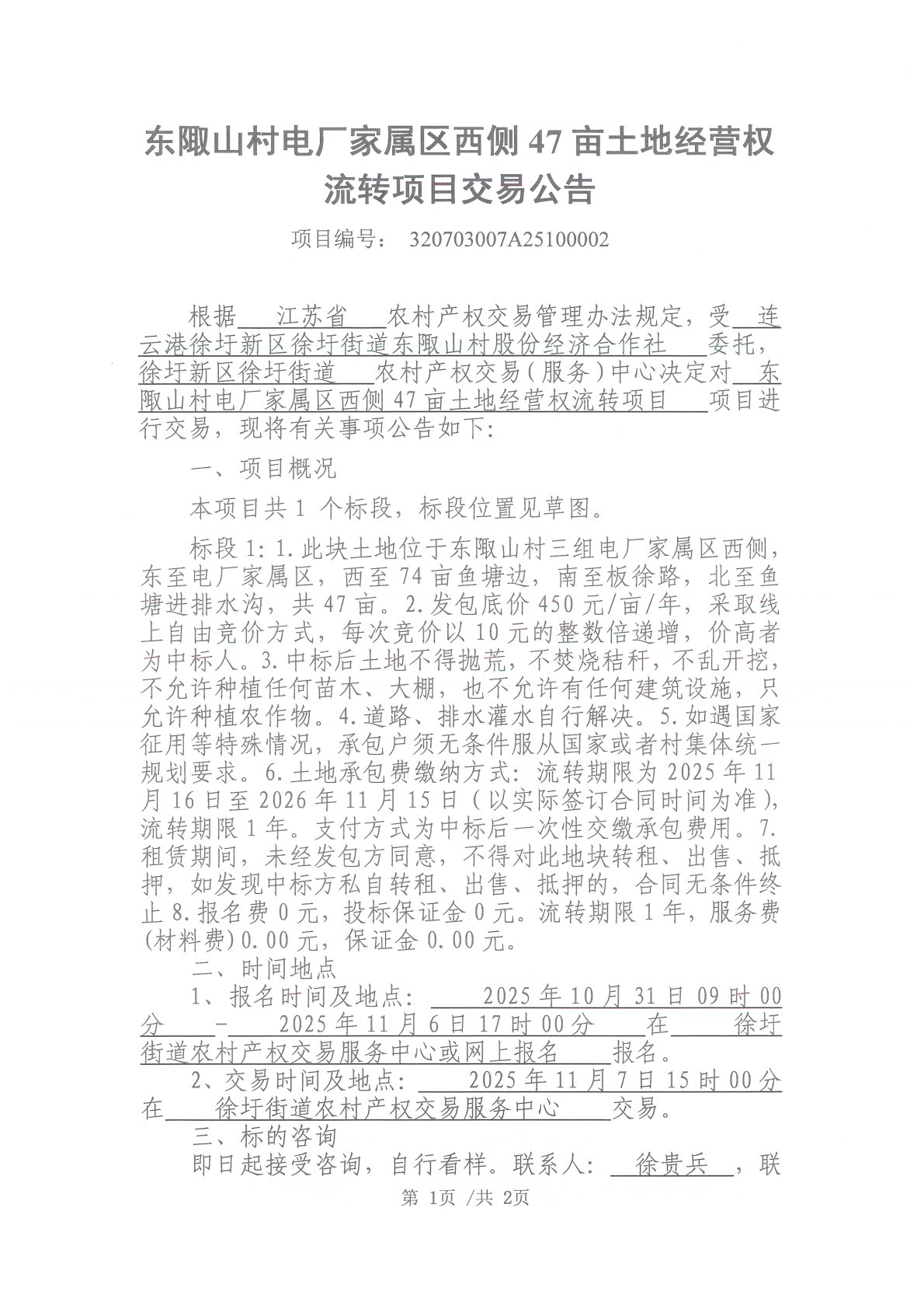 东陬山村电厂家属区西侧47亩土地经营权流转项目交易公告